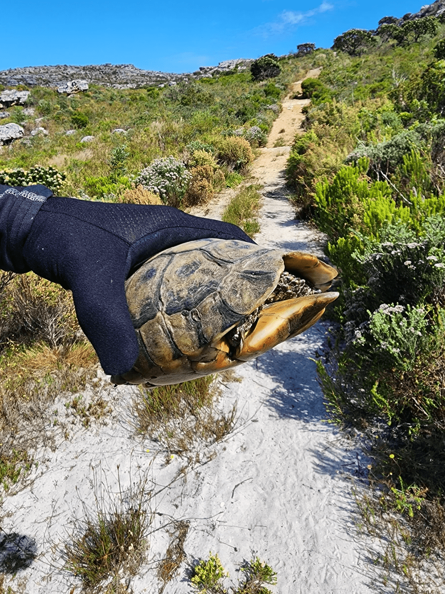 After Redhill there was a small decent to Lewis Gay dam where the tar ends, and the wildlife begins. My first encounter was with a tortoise who was crossing the sandy trail.