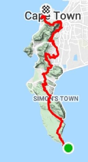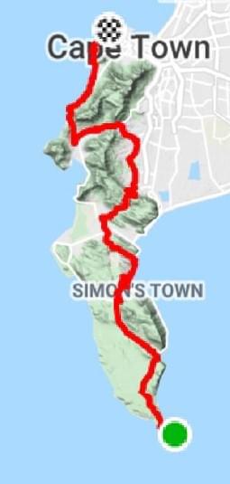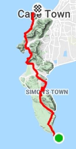As you can see, this route sets off from Cape Point, out the gate and on to Plateau Road in the direction of Scarborough. From there is a clear run to Red Hill Road, Pine Haven, past the Lewis Gay Dam, over Black Hill, up Ou Wa Pad, down the Tokai MTB trails (the Beast and Snakes), into the Green Belts, over Kirstenbosch Loop, past Rhodes Memorial, up Devil's Peak to Tafelberg Road, Cable Station, passing Lions Head left and then going all the way to Green Point.