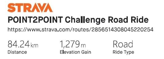 You have completed the Point2Point ROAD Challenge!Be sure to stop your cyclometer/STRAVA and save this file. Also take a screenshot of your STRAVA reading in preparation for uploading this to the POINT2POINT Challenge ROAD Wall of Fame.