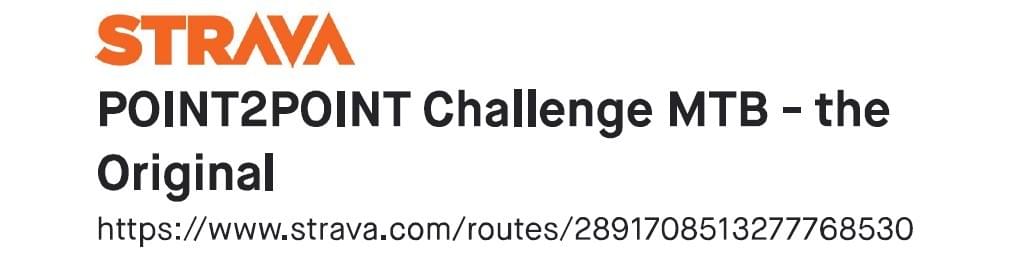 You have completed the POINT2POINT Challenge MTB!Be sure to stop your cyclometer/STRAVA and save this file. Also take a screenshot of your STRAVA reading in preparation for uploading this to the POINT2POINT Wall of Fame.